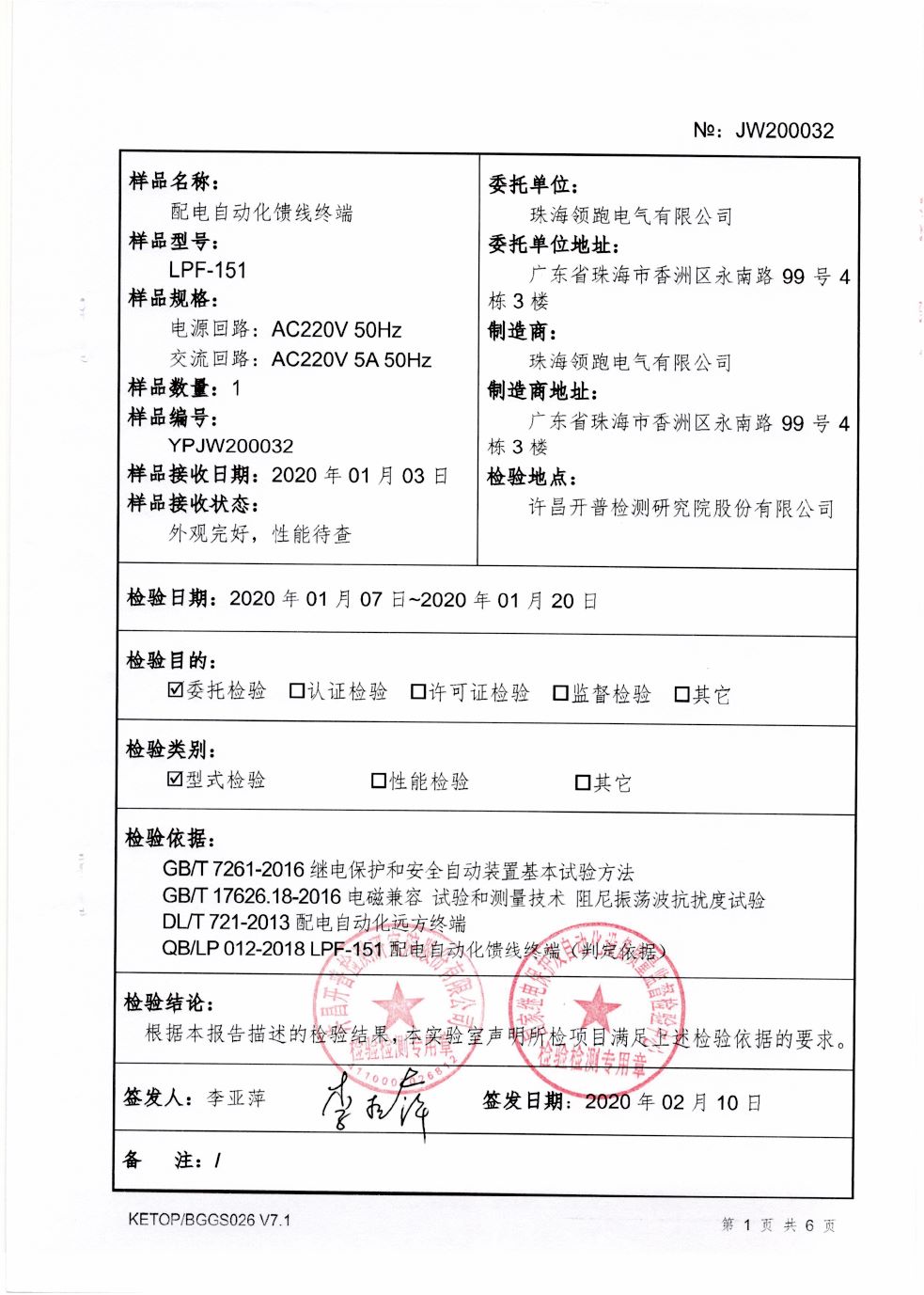 LPF-151馈线终端型式试验报告