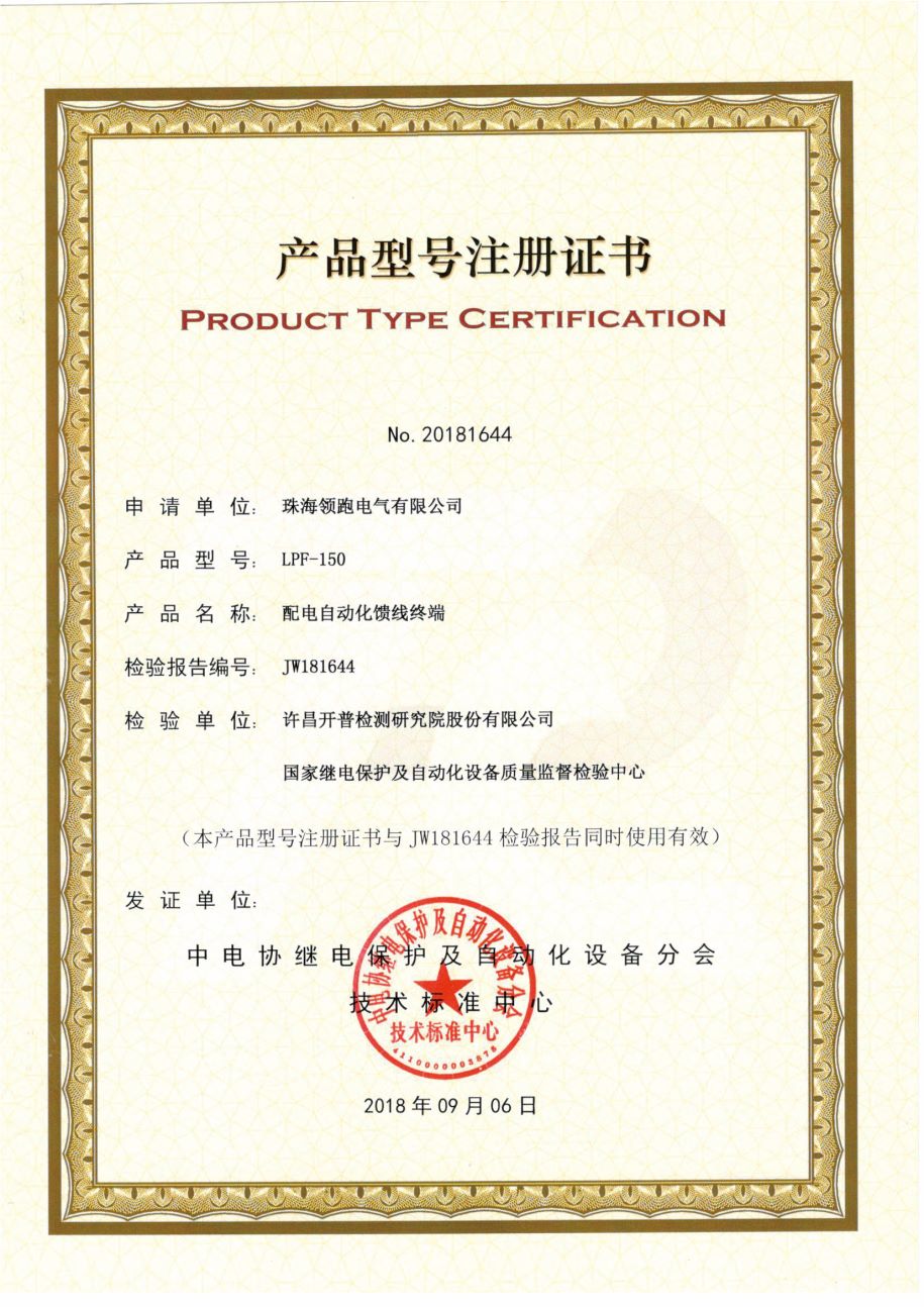 LPF-150馈线终端产品注册证书